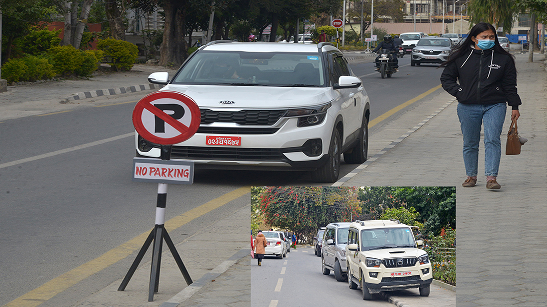 सिंहदरवारका सडकमा नो पार्किङको ट्राफिक संकेत यत्रतत्र राखिएका छन् । तर, नियमविपरीत पार्किङ पनि उत्तिकै छ ।