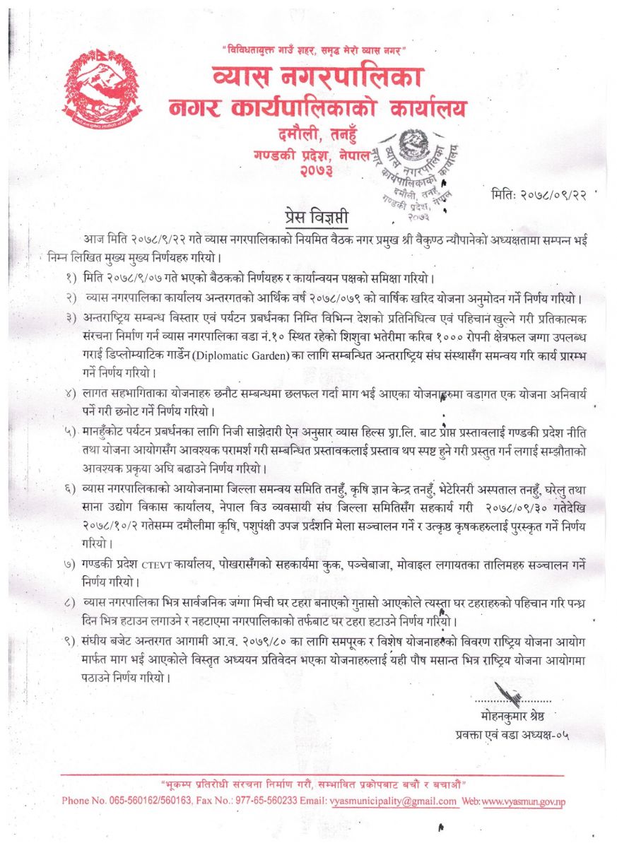 तनहुँको व्यास नगरपालिकाको बिहीबार बसेको कार्यपालिका बैठकको निर्णय सार्वजनिक भएसँगै जिल्लामा तरङ्ग पैदा भएको छ । कार्यपालिका बैठकको निर्णय सार्वजनिक गर्न जारी प्रेस विज्ञप्तिको पाँचौँ बुँदाले तरङ्ग पैदा गराएको हो ।