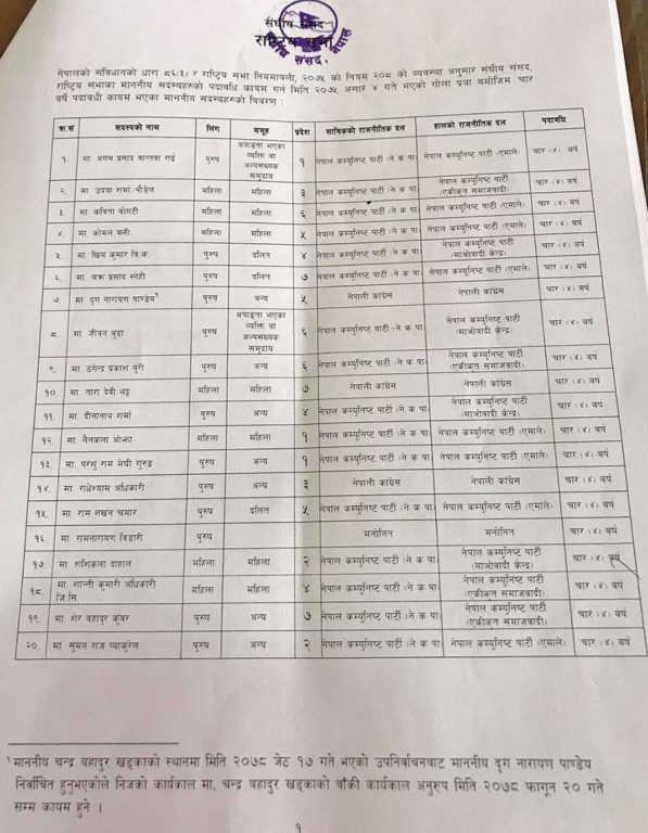 यसैगरी नेपाली कांग्रेसका दृगनारायण पाण्डे, तारादेवी भट्ट र राधेश्याम अधिकारी नेकपा माओवादी केन्द्रका खिमकुमार विक, जीवन बुढा, दीनानाथ शर्मा र शशीकला दाहाल तथा नेकपा एकीकृत समाजवादीका उदया शर्मा पौडेल, ठगेन्द्रप्रकाश पुरी, शान्तिकुमारी अधिकारी जिसी र शेरबहादुर कुँवरको पद पनि आजबाट समाप्त हुँदैछ ।